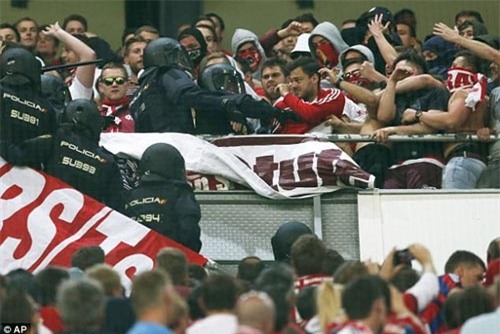 Truyền thông chưa tìm hiểu được nguyên nhân nào dẫn đến vụ lộn xộn trên khán đài buộc cảnh sát phải ra tay. Theo DailyMail, cảnh sát Tây Ban Nha và CĐV Bayern Munich đã đụng độ căng thẳng.