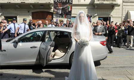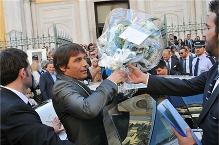 | Conte và hôn thê lên xe tới địa điểm cưới trong vòng vây chúc tụng của khoảng 100 fan Juve. |