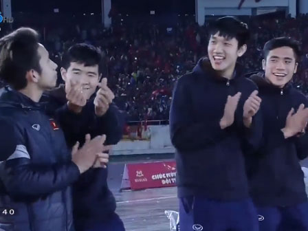 Trong lúc các cầu thủ đang gửi lời chào đến cổ động viên qua góc máy quay, tiếng pháo bất ngờ vang lên khiến Bùi Tiến Dụng giật mình. Biểu cảm "giật bắn cả mình" hài hước của chàng trai Thanh Hoá nhanh chóng được dân mạng ghi lại.