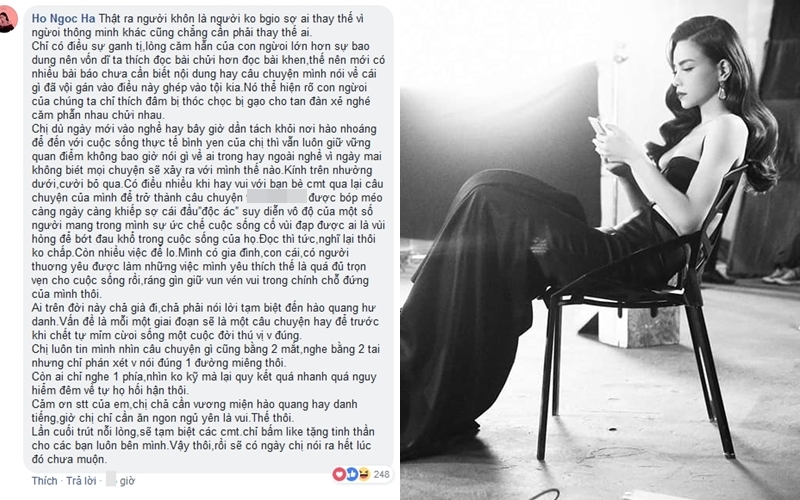 Bức xúc vì miệng đời, Hồ Ngọc Hà đưa quan điểm riêng khi trải qua nhiều sóng gió: "Đọc thì tức, nghĩ lại thôi không chấp vì còn nhiều việc để lo. Chị có gia đình, con cái, có người thương yêu, được làm những việc mình yêu thích thế là quá đủ trọn vẹn cho cuộc sống rồi. Ráng gìn giữ vun vén vui trong chính chỗ đứng của mình thôi.