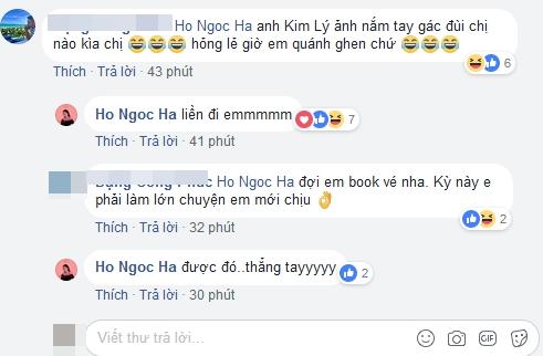 Một fan báo với nữ ca sĩ họ Hồ: "Chị Hồ Ngọc Hà ơi, anh Kim Lý đang nắm tay gác đùi chị nào kìa. Không lẽ giờ em đánh ghen chứ. Chị đợi em book vé nha. Kỳ này phải làm lớn chuyện em mới chịu".