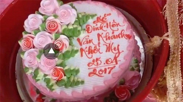 Cận cảnh chiếc bánh kem với dòng chữ: “Lễ đính hôn Văn Khánh - Khởi My 25/04/2017”.