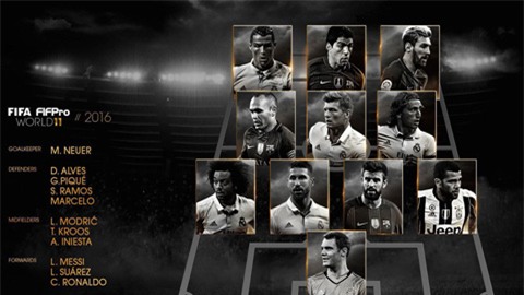 Đội hình tiêu biểu năm 2016 chứng kiến sự áp đảo tuyệt đối của Real Madrid và Barcelona. Cụ thể, hai gã khổng lồ của bóng đá Tây Ban Nha này đóng góp tới 9 gương mặt trong đội hình, 5 cầu thủ Real và 4 cầu thủ Barca.