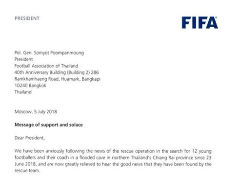 FIFA đã gửi lời mời dự chung kết World Cup 2018 đồng tỏ bảy tỏ sự cảm thông sâu sắc đối với đội bóng Thái Lan đang bị mắc kẹt tại hang Tham Luang.