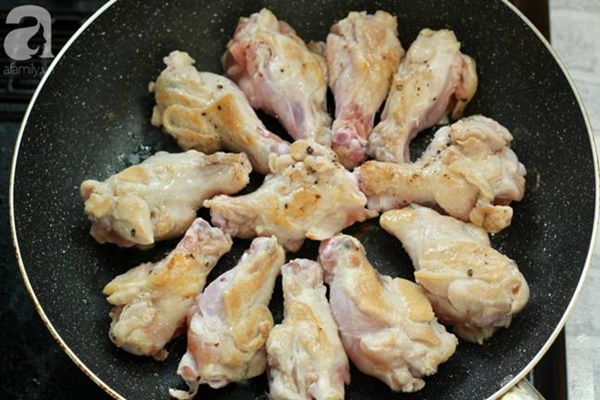 - Bước 3: Bắc chảo lên bếp, cho vào chảo 1 muỗng canh dầu oliu. Cho thịt gà lên chiên cho vàng đều hai mặt. Không cần chiên chín. Khi thịt vàng đều thì gắp ra đĩa để riêng.