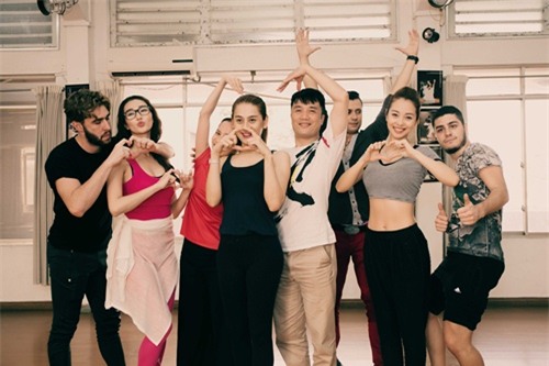 Jennifer Phạm, Lâm Chi Khanh và Khánh My nhí nhảnh chụp ảnh cùng biên đạo Hồng Việt sau buổi tập.