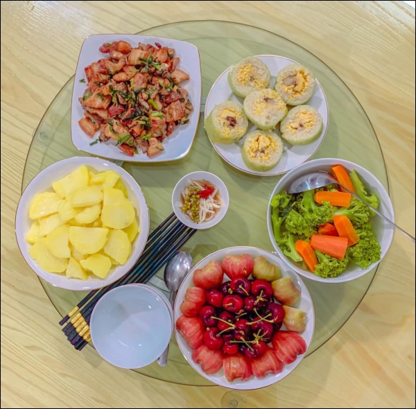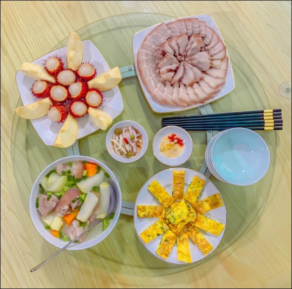 Thực đơn mâm cơm gia đình của Giang Hương thường có 3 - 4 món như món mặn, món xào, canh và luôn có hoa quả tráng miệng. Nếu có khách thì cô sẽ chế biến nhiều món hơn. Thời gian thực hiện các món ăn của Giang Hương không mất nhiều thời gian mà chỉ tầm khoảng 40 - 50 phút.