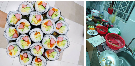 Nhưng mà, vấn đề là Hồ Nhi chỉ thích nấu thôi còn dọn dẹp và rửa bát thì không! Nên là, mỗi khi ăn ngon xong thì bạn trai Hồ Nhi đều phải nai lưng ra để vật lộn với đống lộn xộn trong bếp mà cô nàng đã bày ra trong quá trình nấu nướng. Mà cô nàng này cũng giỏi bày lắm. Làm mỗi dĩa kimbap thôi mà cái bếp có khác gì bãi chiến trường đâu.