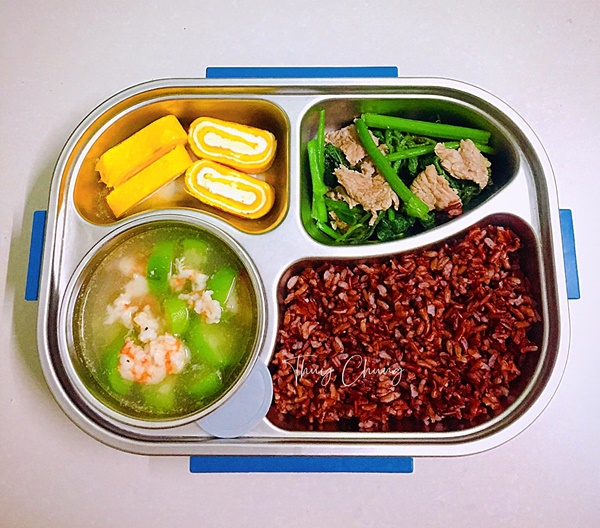Cơm gạo lức; Trứng cuộn; Canh mướp nấu tôm; Bò xào bông bí.