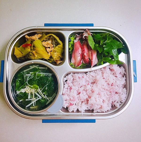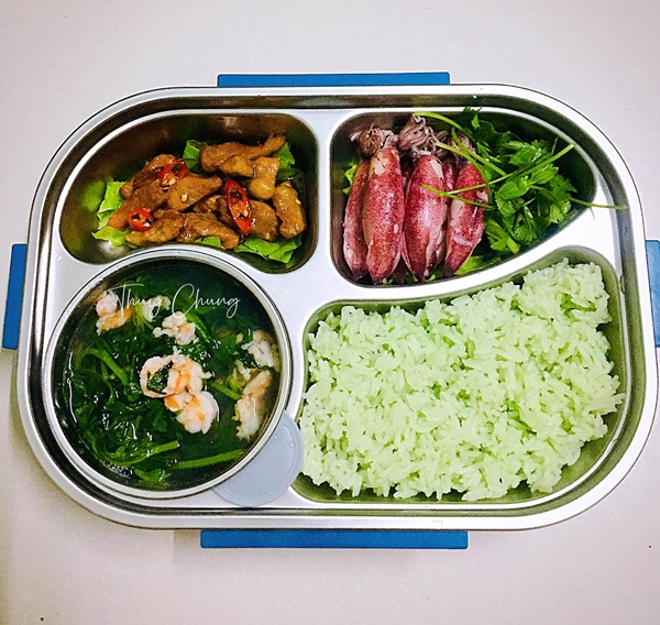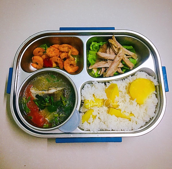 Cô bạn Phạm Thuỳ Chung (hiện sống và làm việc tại Đà Nẵng) thường xuyên là một nhân viên ngành ngân hàng năng động, nhiệt huyết. Do tính chất công việc bận rộn, ra ngoài ăn mất nhiều thời gian lại không đảm bảo vệ sinh nên để đảm bảo sức khoẻ Thuỳ Chung thường xuyên nấu cơm mang đi làm ăn trưa. Nhìn những hộp cơm đơn giản mà đầy đủ chất dinh dưỡng, ngon miệng của Thuỳ Chung giúp chị em có thêm động lực mang đồ đi làm ăn trưa.
