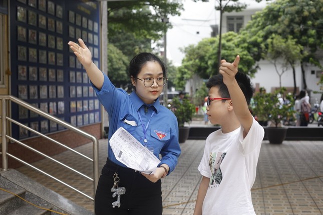 Sinh viên tình nguyện của Trường Đại học Sư phạm Hà Nội hỗ trợ phân luồng và hướng dẫn phụ huynh đưa con đến phòng thi
