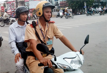 Thiếu uý Lê Xuân Linh – Đội CSGT số 3 và em Phạm Văn Duy. |