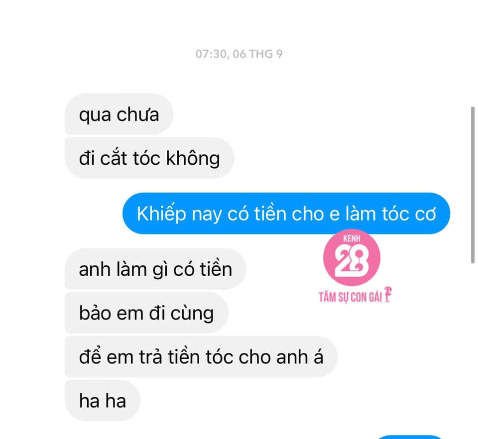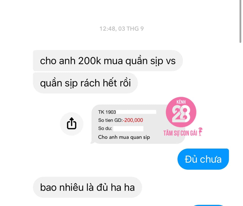 “Lát mua anh lọ nước rửa bát nha”, “Qua chưa, cho anh 50 nghìn nạp điện thoại với”, “Cho anh 200 nghìn mua quần sịp với”, “Em đi cùng để trả tiền cắt tóc cho anh”, “Cho anh một triệu đi, anh hết tiền ăn rồi, chuyển khoản luôn nha, không là anh giận đó”…