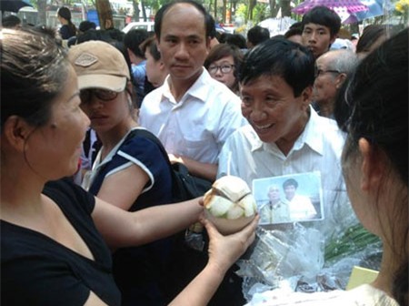 Trong khi chúng tôi đang trò chuyện với cô Thu, anh Nguyễn Khắc Sơn (Thị trấn Quang Minh, Mê Linh, Hà Nội) đề nghị được đóng góp 500.000 đồng, coi như chút tấm lòng để dành mua nước cho những người thăm viếng. Anh Sơn nói: “Tôi chỉ nghĩ là góp một phần động viên đồng bào trong khi viếng Đại tướng”.