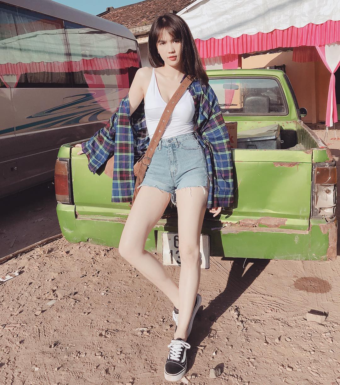 Street style mới nhất, Ngọc Trinh khỏe khoắn năng động với jeans short, áo crop top, khoác ngoài với sơmi caro oversized. Một set đồ không quá mới nhưng vẫn thu hút với vẻ phóng khoáng bụi bặm và đặc biệt là vẫn tôn được đôi chân dài cùng vòng eo thon trứ danh của Ngọc Trinh.