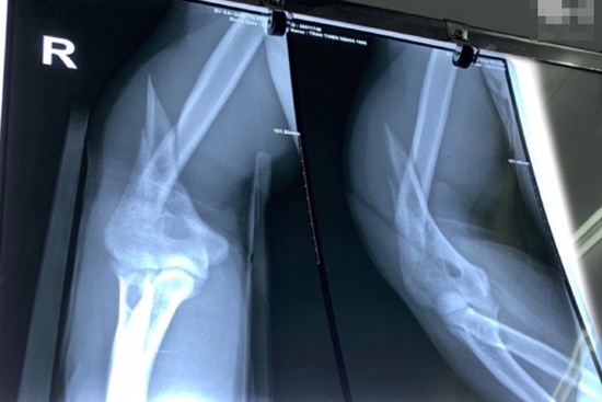 Trong quá trình đùa giỡn, bệnh nhân thử chơi trò vật tay với bạn nhưng không may xảy ra sự cố kinh hoàng.