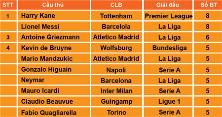 Ngoài những cái tên kể trên, bảng xếp hạng này còn khá nhiều tên tuổi nổi tiếng khác Kevin De Bruyne (Wolfsburg), Gonzalo Higuain (Napoli), Neymar (Barca), Mauro Icardi (Inter Milan),…