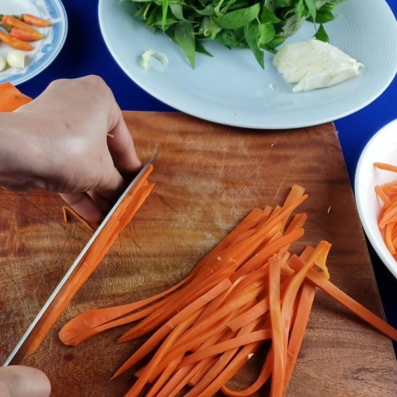 Đầu tiên, bạn nạo vỏ cà rốt, rửa sạch và bào hoặc thái thành dạng sợi. Bắp cải rửa sạch, thái sợi nhỏ và để ráo. Rau răm cũng rửa sạch và thái sợi. Tỏi bóc vỏ, thái lát mỏng. Gừng nạo vỏ, thái sợi. Ớt rửa sạch, bỏ cuống và cắt đôi hoặc cắt lát đều được.