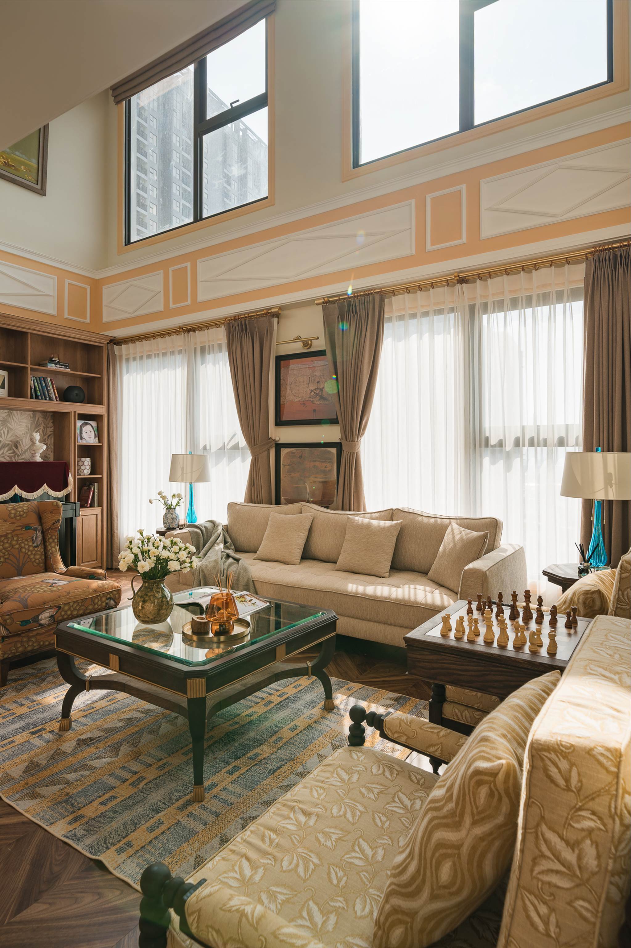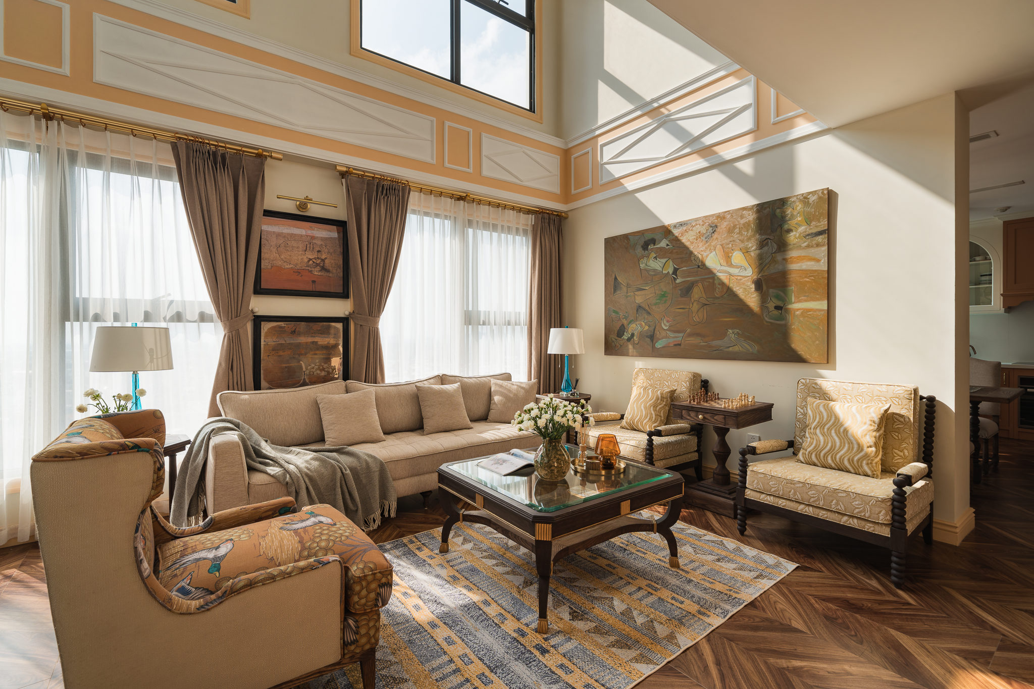 Không gian thông tầng phòng khách được thiết kế với cửa kính lớn kết hợp rèm che, tạo cho căn hộ sự thoáng đãng nhưng cũng đảm bảo yếu tố riêng tư khi cần.