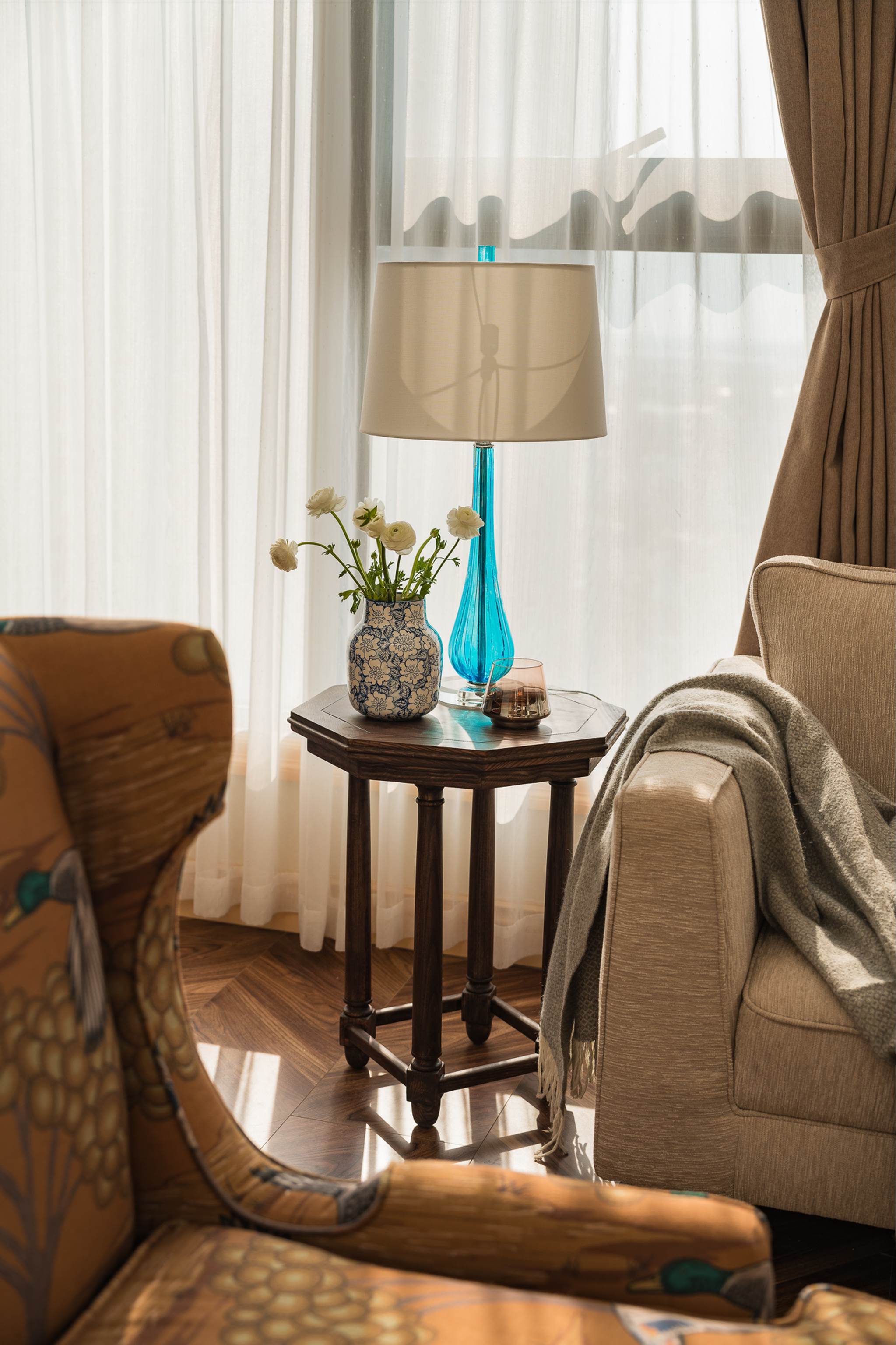 Một chiếc ghế nhẹ nhàng với hoa văn xanh trắng được đặt cạnh khu vực đón ánh sáng giúp cho gia chủ có những phút giây thư giãn và thoải mái.