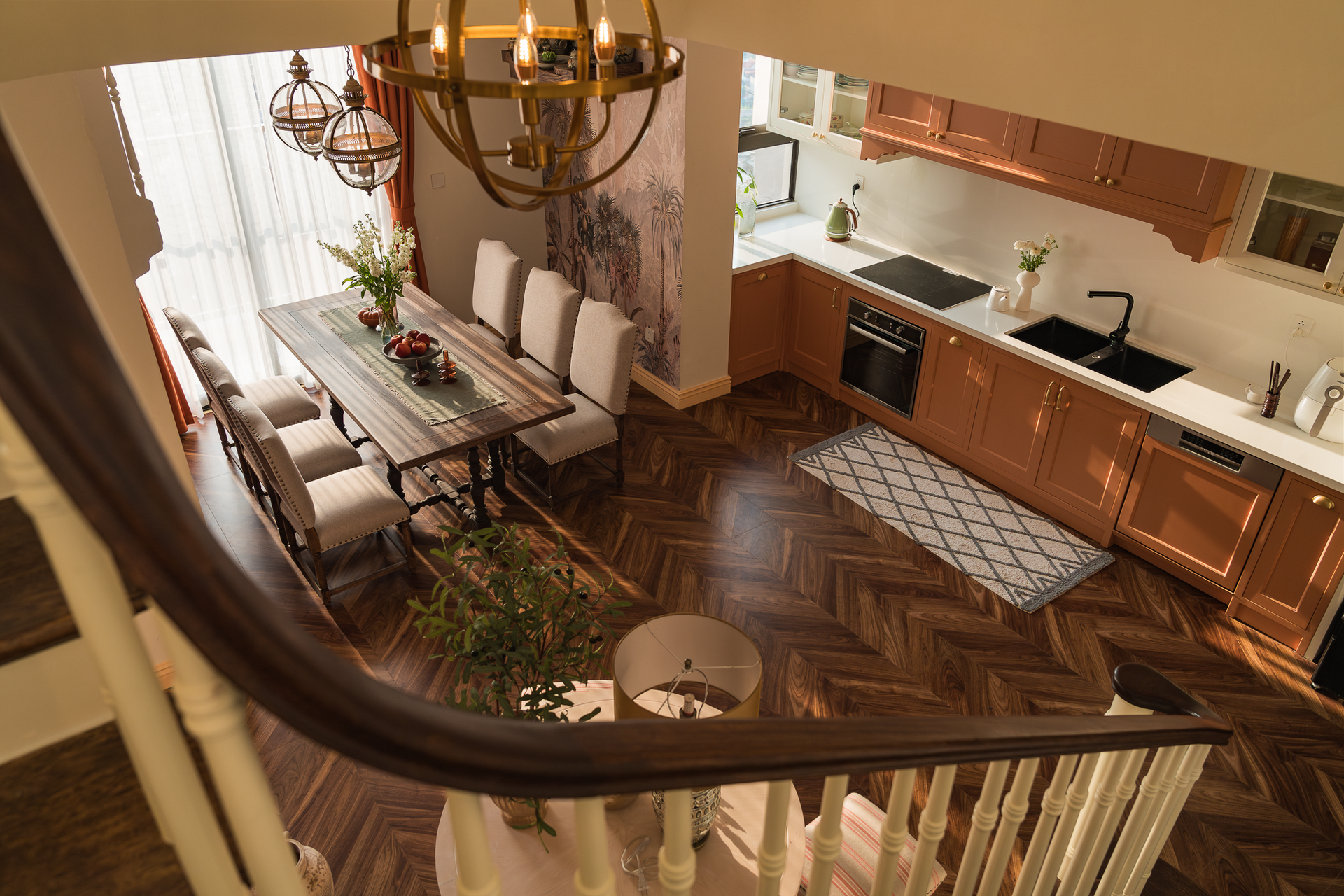 Phòng bếp được thiết kế với tông cam chủ đạo. Họa tiết giấy dán tường và tranh trang trí mang hơi hướng đương đại với tông màu vàng, cam đất, khiến cho người xem như có cảm giác lạc vào trong những thước phim điện ảnh.