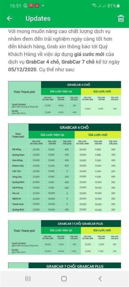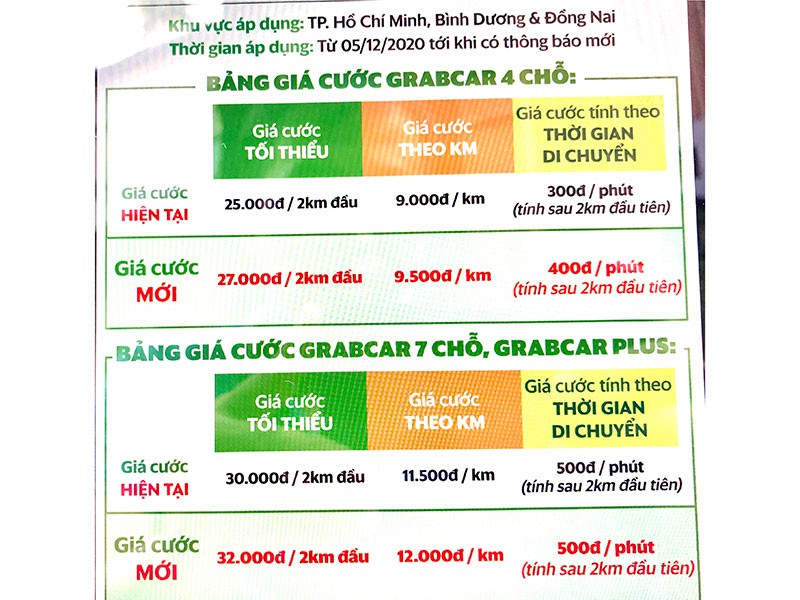 Theo thông báo của Grab, từ ngày 5-12, giá cước tối thiểu của GrabCar tại Hà Nội sẽ tăng thêm 2.000 đồng. Tại TP.HCM, Bình Dương, Đồng Nai, giá cước tối thiểu của GrabCar cũng tăng thêm 2.000 đồng. Giá các dịch vụ GrabBike, GrabFood, GrabExpress cũng được điều chỉnh tăng.