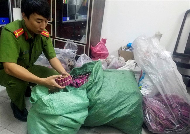 Tại ngôi nhà bà Thêm, công an phát hiện nhiều pháo bánh và pháo dây với tổng trọng lượng hơn 130 kg. Làm việc với cơ quan công an, bà lão không đưa ra được giấy phép sử dụng pháo.