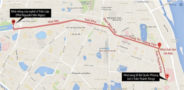 Lộ trình đoàn xe đưa linh cữu ca sĩ Trần Lập từ Nhà tang lễ Bộ Quốc phòng về nhà riêng sáng 23/3.