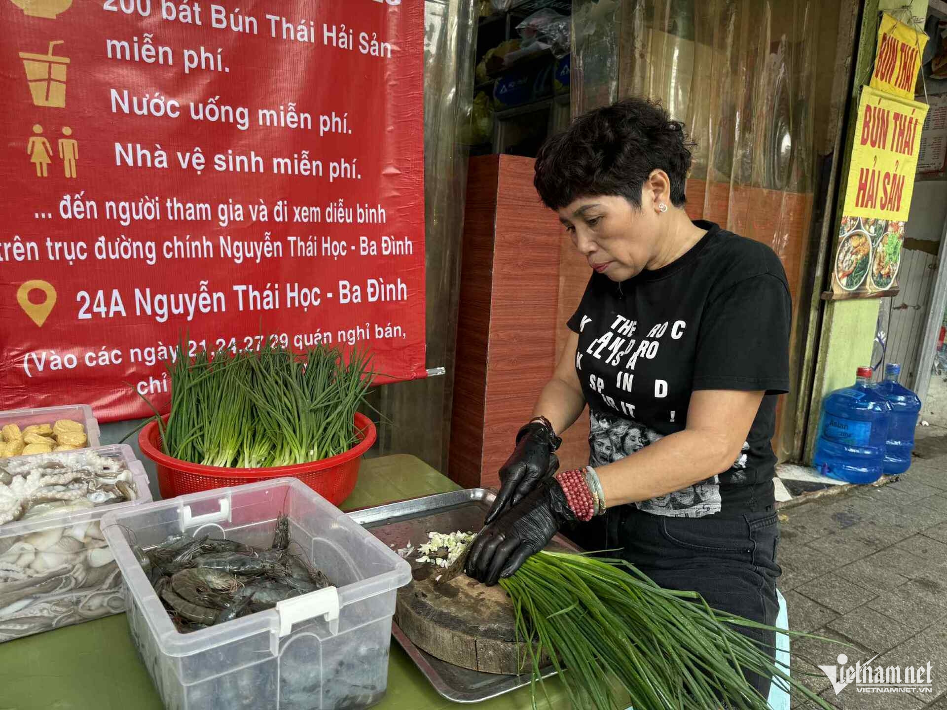 “Cửa hàng nhà tôi nằm ngay ở mặt phố Nguyễn Thái Học, rất đông người dân và du khách đổ về. Ba ngày hợp luyện và sơ duyệt, chúng tôi mở hàng phục vụ miễn phí bà con vào 17h. Chỉ hơn 1 tiếng là quán hết 200-225 bát bún", anh Sơn kể.