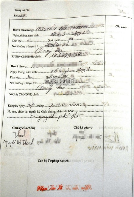 Giấy đăng ký kết hôn của Thanh với người vợ ở quê, (Tư liệu do công an xã Quảng Đại cung cấp). |