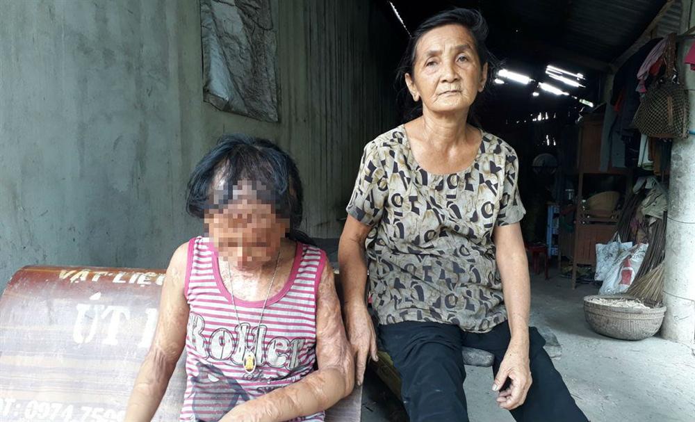 Bà Tâm ngồi cạnh đứa cháu nội bất hạnh bị tạt axít tàn phế. Ảnh: Thanh Lâm.