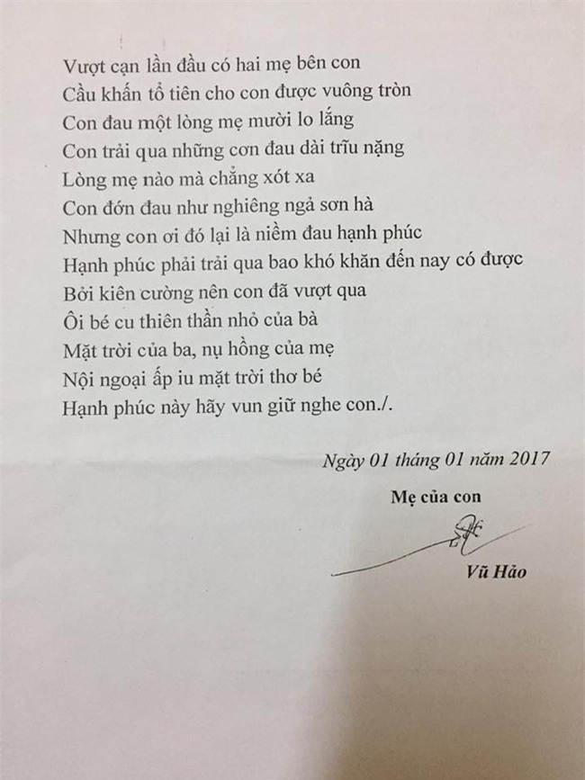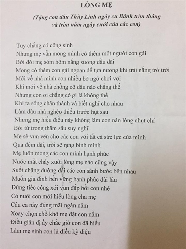Tiện đây em đăng bài thơ mẹ chồng tặng em nhân ngày bé nhà em đầy tháng. Trên đời này vẫn còn có rất nhiều mẹ chồng tâm lý và tốt bụng lắm ạ. Cứ sống chân thành rồi mọi thứ sẽ đến vớii mình!".