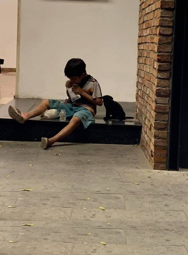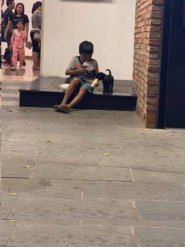 Nơi góc nhỏ dưới chân của một chung cư, có một cậu bé nghèo tươm, chân đi dép, mặt mày lấm lem, trên vai đeo chiếc túi con con. Nhìn qua, không quá khó để đoán được thằng bé là điển hình của những đứa trẻ đường phố, phải ra đời mưu sinh kiếm miếng ăn từ sớm. Trên tay thằng bé còn ôm một chú chó con, chẳng biết là từ đâu mà nó có được. Sau đó, nó mở bịch sữa, đổ một phần vào bình rồi cho con chú uống, phần còn lại, dành cho mình.