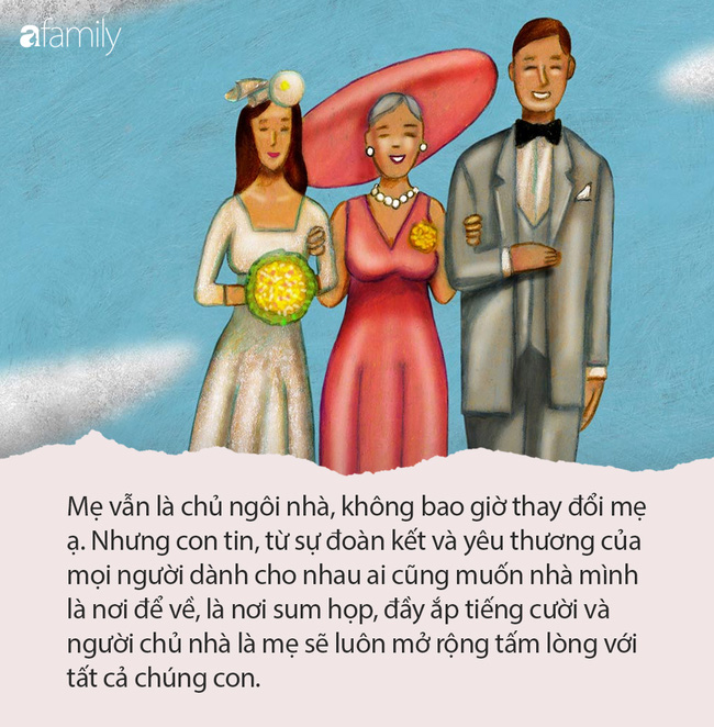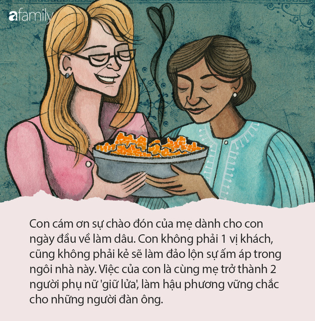 Nhà vẫn là nhà của mẹ, chồng con vẫn là con trai của mẹ nhưng có thêm con là thành viên mới trong gia đình mình - người không chung dòng máu nhưng vì tình yêu mà sẽ gắn bó với nhà mẹ cả đời. Con cám ơn sự chào đón của mẹ dành cho con ngày đầu về làm dâu. Con không phải 1 vị khách, cũng không phải kẻ sẽ làm đảo lộn sự ấm áp trong ngôi nhà này. Việc của con là cùng mẹ trở thành 2 người phụ nữ 'giữ lửa', làm hậu phương vững chắc cho những người đàn ông.