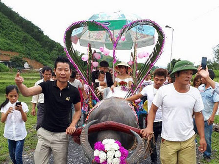 Thông thường khi rước dâu, nhà trai sẽ sử dụng các phương tiện như xe hơi hay độc đáo hơn thì xích lô, xe máy, nhưng có lẽ hiếm ai lại sử dụng... trâu để đi đón dâu giống như cặp đôi ở xã Thanh Hương, huyện Thanh Chương (Nghệ An).