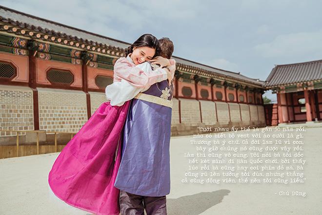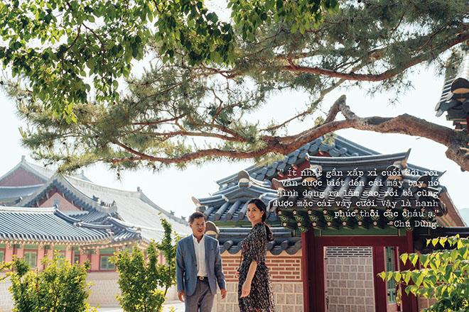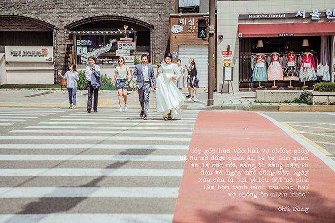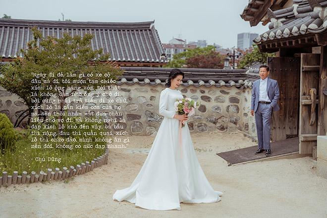 "Cưới nhau ấy thế là gần 30 năm rồi, nào có biết bộ vest với áo cưới là gì. Tôi cũng thương bà ý chứ. Cả đời lam lũ vì con, bây giờ chúng nó cũng được vậy rồi. Tôi nói với bà ấy là tôi dốc hết két, mình đi Hàn Quốc chơi, bởi thấy lúc rỗi bà cũng hay coi phim đó mà. Bà cũng rú lên tưởng tôi đùa, nhưng thằng cả cũng động viên, thế nên tôi cũng liều. Ít nhất gần xấp xỉ cuối đời rồi vẫn được biết đến cái máy bay nó hình dạng ra làm sao, rồi bà cũng được mặc cái váy cưới. Vậy là hạnh phúc thôi các cháu ạ."