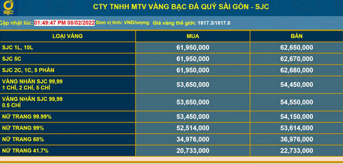Cập nhật lúc 12h ngày 8/2, doanh nghiệp lớn tại Hà Nội niêm yết giá vàng miếng SJC tại 61,9 - 62,65 triệu đồng/lượng (mua - bán), giảm 900.000 đồng/lượng mỗi chiều so với phiên 7/2. Tại TPHCM, giá thu mua tương đương Hà Nội nhưng chiều bán ra là 62,55 triệu đồng/lượng, giảm 900.000 đồng mỗi chiều.