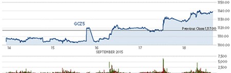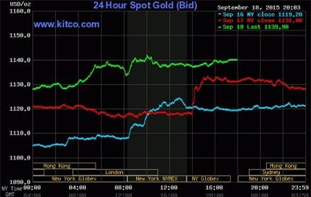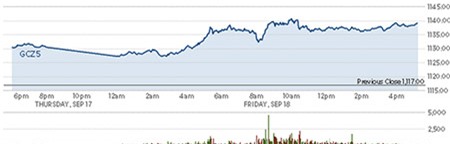 Giá vàng chốt phiên cao thứ nhì trong tháng Chín, sau quyết định giữ nguyên lãi suất ở mức thấp kỷ lục của Fed.