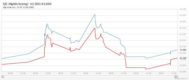 Công ty vàng bạc đá quý Sài Gòn niêm yết giá vàng SJC ở mức 44,30 triệu đồng/lượng (mua vào) và 44,82 triệu đồng/lượng (bán ra), tăng 650 ngàn đồng ở chiều mua vào và tăng 800 ngàn đồng chiều bán ra so với cuối giờ ngày 7/1.