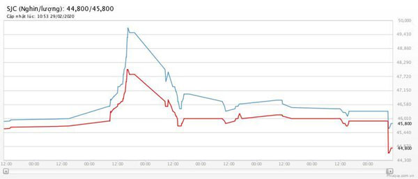 Tiếp các phiên sau đó, giá vàng giao dịch ở ngưỡng 45,8-46,6 triệu đồng/lượng. Ngày 28/2, giá vàng miếng trong nước được Tập Đoàn Vàng bạc đá quý Doji niêm yết ở mức: 46,1 triệu đồng/lượng (mua vào) và 46,40 triệu đồng/lượng (bán ra).