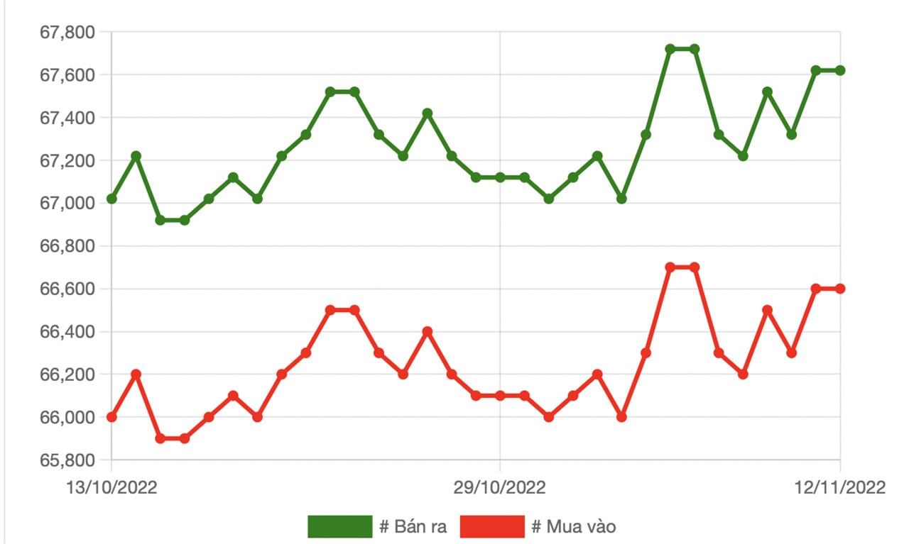Kết thúc phiên 12/11, giá vàng miếng 9999 tại SJC TP.HCM là 66,6 triệu đồng/lượng (mua vào)- 67,6 triệu đồng/lượng (bán ra). SJC Hà Nội niêm yết ở mức 66,6 triệu đồng/lượng (mua vào) và 67,62 triệu đồng/lượng (bán ra).
