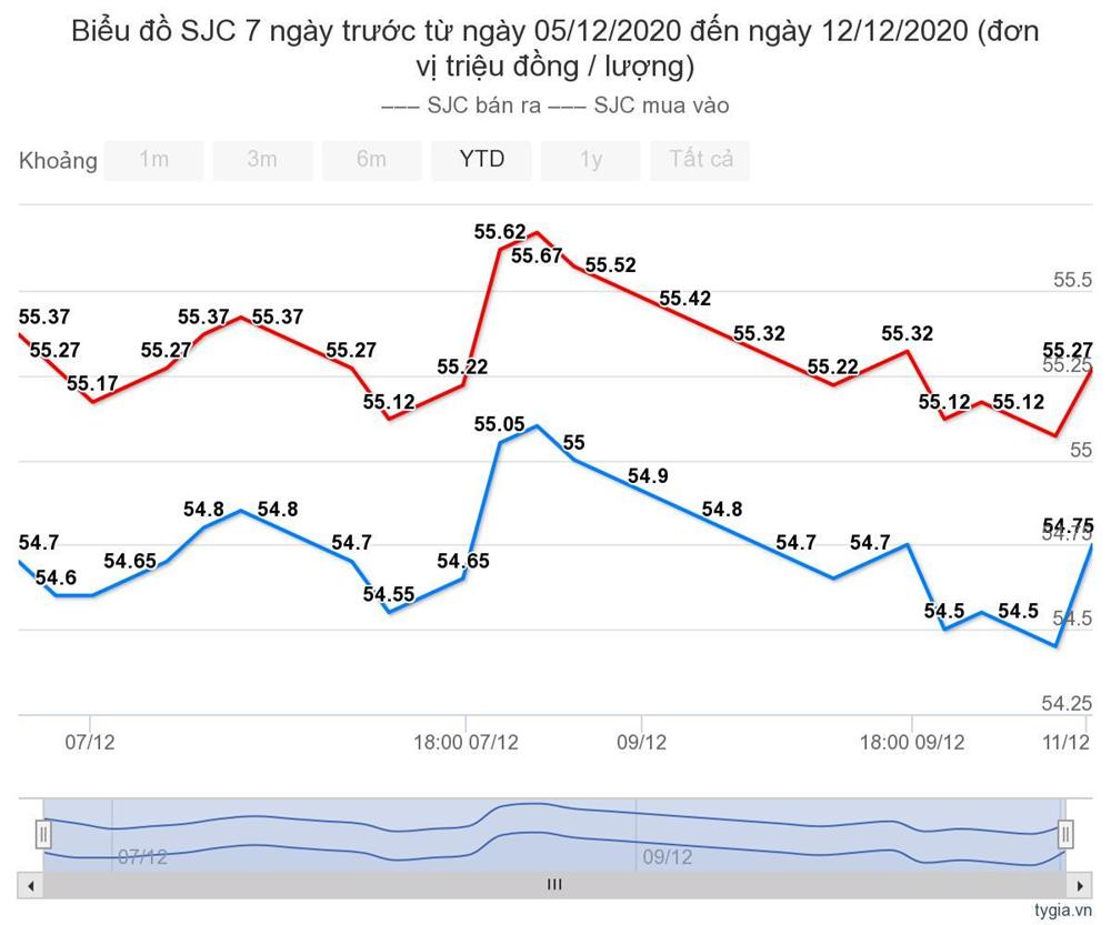 Công ty vàng bạc đá quý Sài Gòn niêm yết giá vàng SJC áp dụng cho khu vực Hà Nội ở mức 54,75 triệu đồng/lượng (mua vào) và 55,27 triệu đồng/lượng (bán ra), tăng 300 nghìn đồng ở chiều mua vào và tăng 200 nghìn đồng chiều bán ra so với cuối phiên giao dịch 10/12.