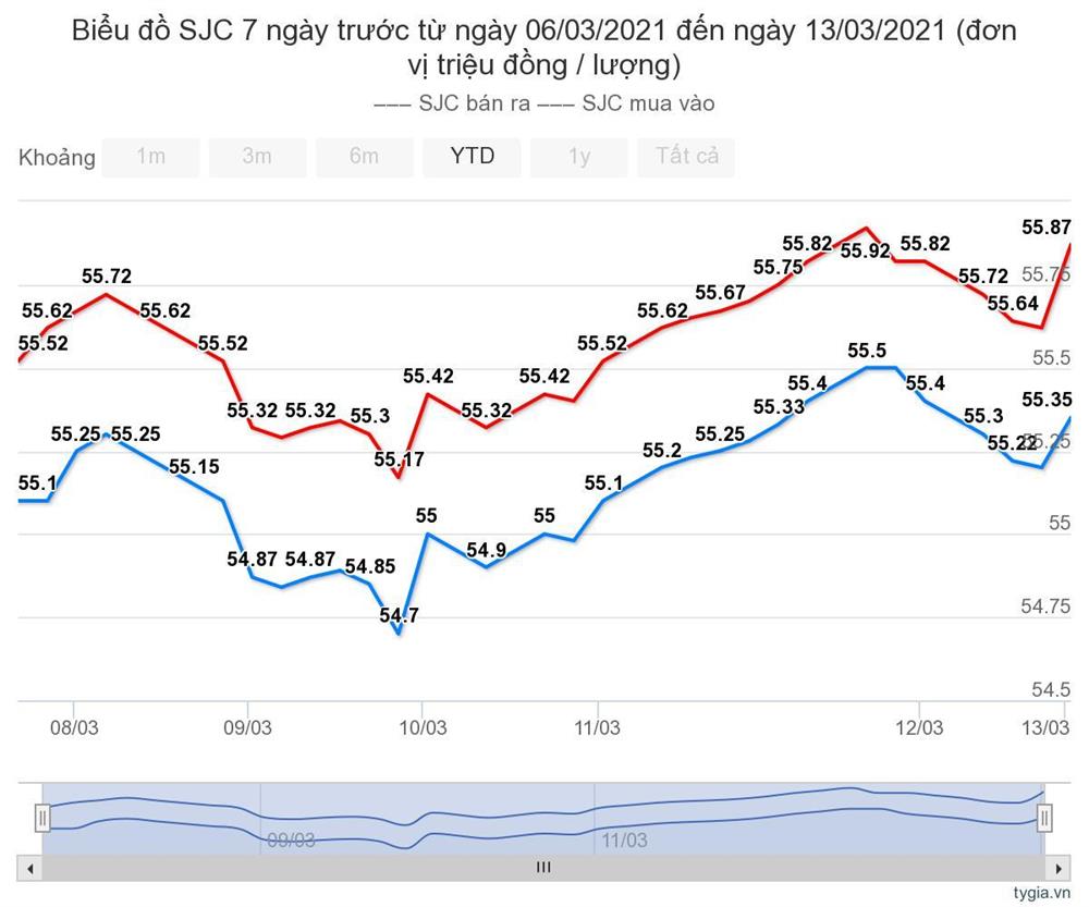 Sau mức thấp nhất tuần này, giá vàng điều chỉnh tăng dần. Mức cao nhất tuần là 55,5 triệu đồng/lượng (mua vào) và 55,92 triệu đồng/lượng (bán ra) vào ngày 11/3. Giá vàng tiếp tục điều chỉnh giảm theo các phiên cuối tuần.