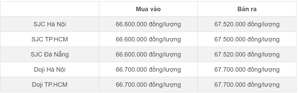 Doji Hà Nội niêm yết ở mức 66,45 triệu đồng/lượng (mua vào) và 67,1 triệu đồng/lượng (bán ra). Doji TP.HCM mua vàng SJC ở mức 66,5 triệu đồng/lượng, bán ra ở mức 67,1 triệu đồng/lượng.