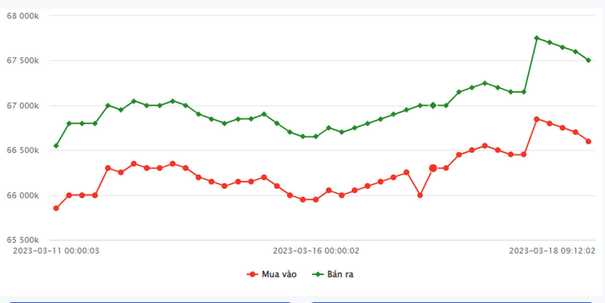 Chốt phiên giao dịch 17/3, giá vàng miếng 9999 tại SJC TP.HCM là 66,45 triệu đồng/lượng (mua vào) - 67,15 triệu đồng/lượng (bán ra). SJC Hà Nội niêm yết ở mức 66,45 triệu đồng/lượng (mua vào) và 67,17 triệu đồng/lượng (bán ra).
