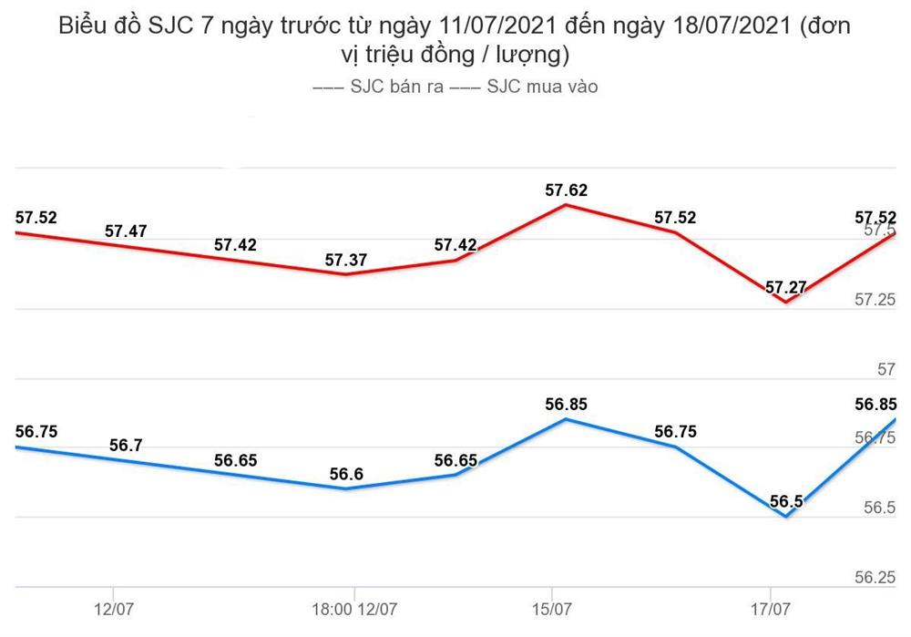 SJC Hà Nội: 56,75 triệu đồng/lượng - 57,52 triệu đồng/lượng