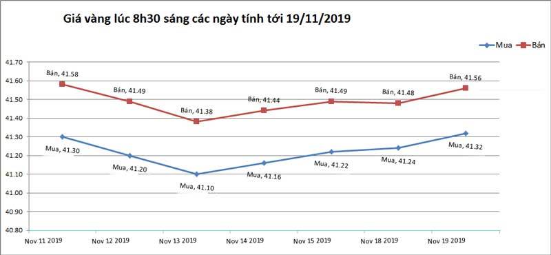 Tính tới cuối phiên giao dịch 19/11, Tập Đoàn Vàng bạc đá quý DOJI niêm yết giá vàng SJC ở mức: 41,23 triệu đồng/lượng (mua vào) và 41,48 triệu đồng/lượng (bán ra). Công ty vàng bạc đá quý Sài Gòn niêm yết vàng SJC ở mức: 41,26 triệu đồng/lượng (mua vào) và 41,50 triệu đồng/lượng (bán ra).