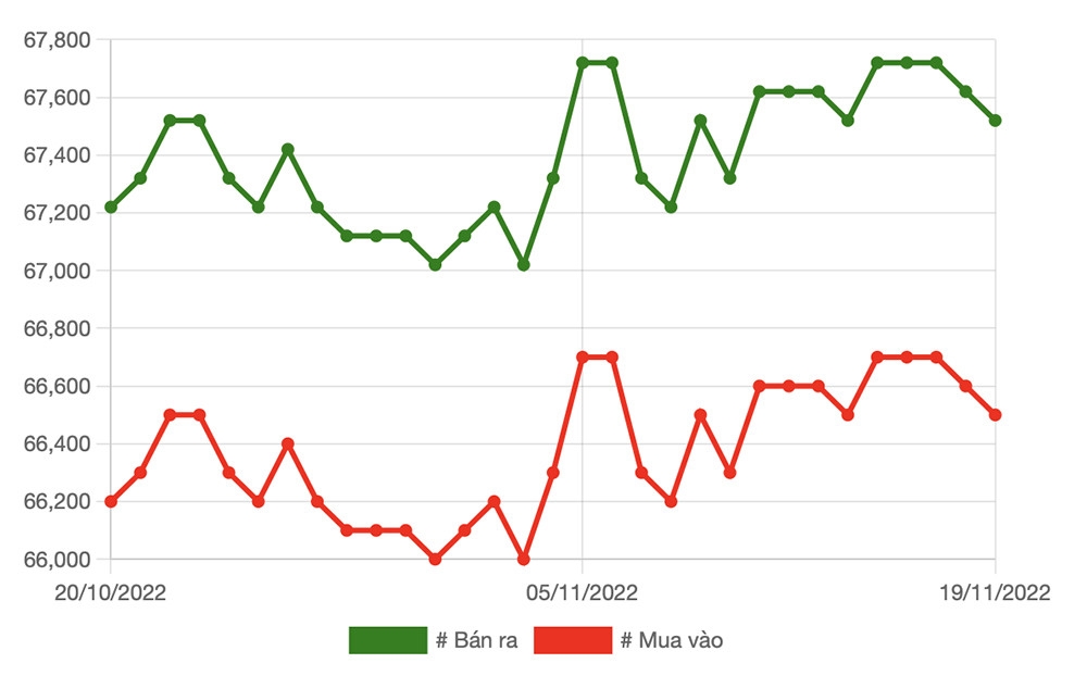 Kết thúc phiên 19/11, giá vàng miếng 9999 tại SJC TP.HCM là 66,5 triệu đồng/lượng (mua vào)- 67,5 triệu đồng/lượng (bán ra). SJC Hà Nội niêm yết ở mức 66,5 triệu đồng/lượng (mua vào) và 67,52 triệu đồng/lượng (bán ra).