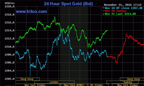 Tính tới 5h10 sáng 22/11 (giờ Việt Nam), giá vàng giao ngay đứng ở mức 1.214 USD/ounce sau một phiên nỗ lực tăng bất thành trên thị trường Mỹ. Đêm qua, giá vàng trên sàn New York có lên tới gần 1.220 USD so với mức đáy sát 1.200 USD/ounce ghi nhận cuối tuần qua.Giá vàng giao tháng 12 trên sàn Comex New York tăng 2 USD lên 1.210,8 USD/ounce.
