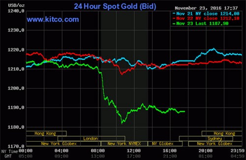 Tính tới 5h10 sáng 24/11 (giờ Việt Nam), giá vàng giao ngay đứng ở mức 1.187,9 USD/ounce sau một phiên đổ dốc trên thị trường Mỹ trước đó. Đêm qua, giá vàng trên sàn New York lao dốc nhanh từ khoảng 1.215 USD có lúc xuống sát 1.180 USD/ounce.